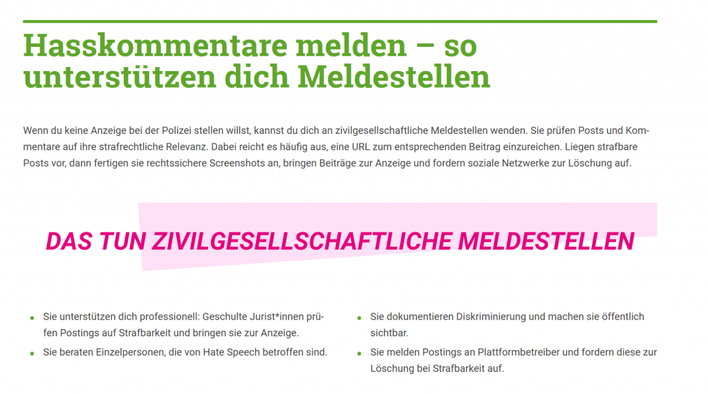 Meldestellen für Hass und Hetze im Netz, die von NGOs betrieben werden, sind in diesem Zusammenhang verfassungsrechtlich hoch ambivalent zu bewerten. Sie bewegen sich in einem Graubereich zwischen zulässigem zivilgesellschaftlichem Engagement und faktischer Vorverlagerung staatlicher Eingriffe in die Meinungsfreiheit.